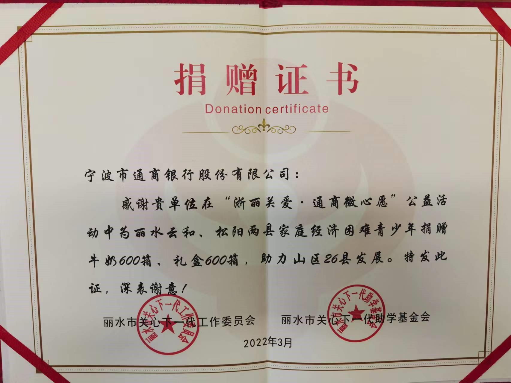 此次活动是我行积极落实浙江高质量发展建设共同富裕示范区,履行企业向上向善、关爱社会,增强社会责任意识的一项具体行动。丽水市关心下一代工作委员会对我行组织开展“浙丽关爱 通商微心愿”公益活动表示感谢,专门寄来了捐赠证书。
