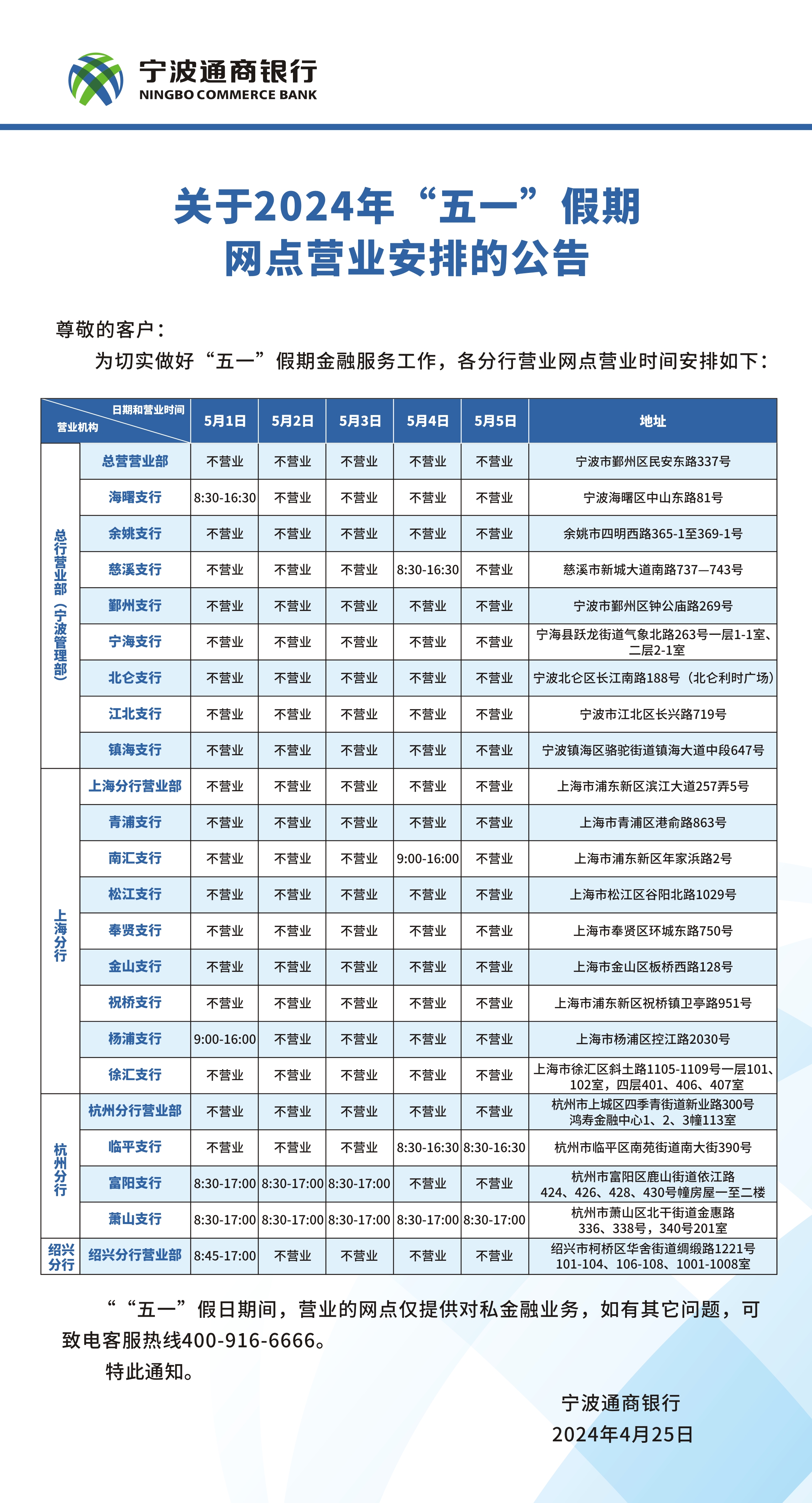 关于2024年”五一“假期网点营业安排的公告