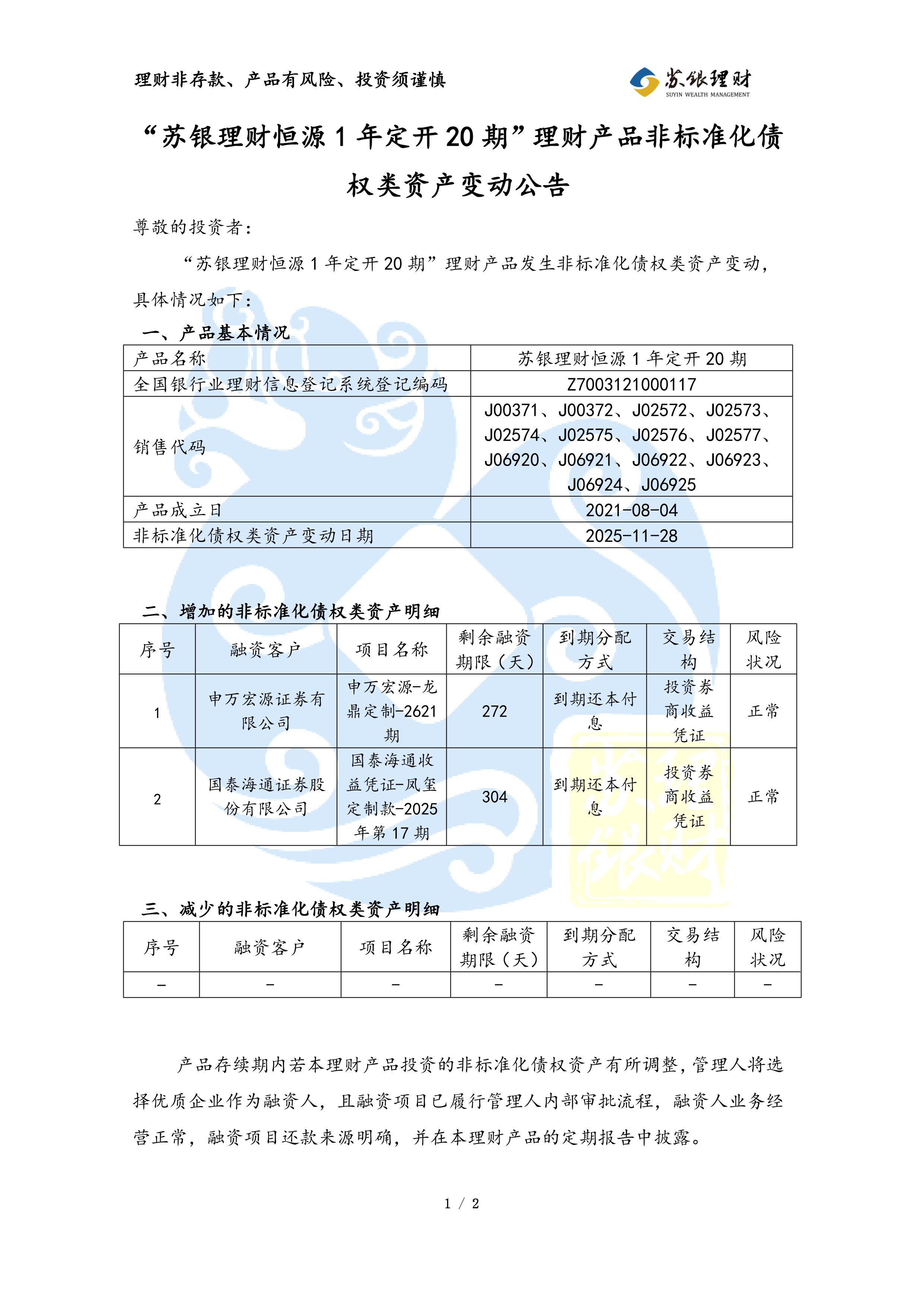 “苏银理财恒源1年定开20期”理财产品非标准化债权类资产变动公告(2025-12-01)