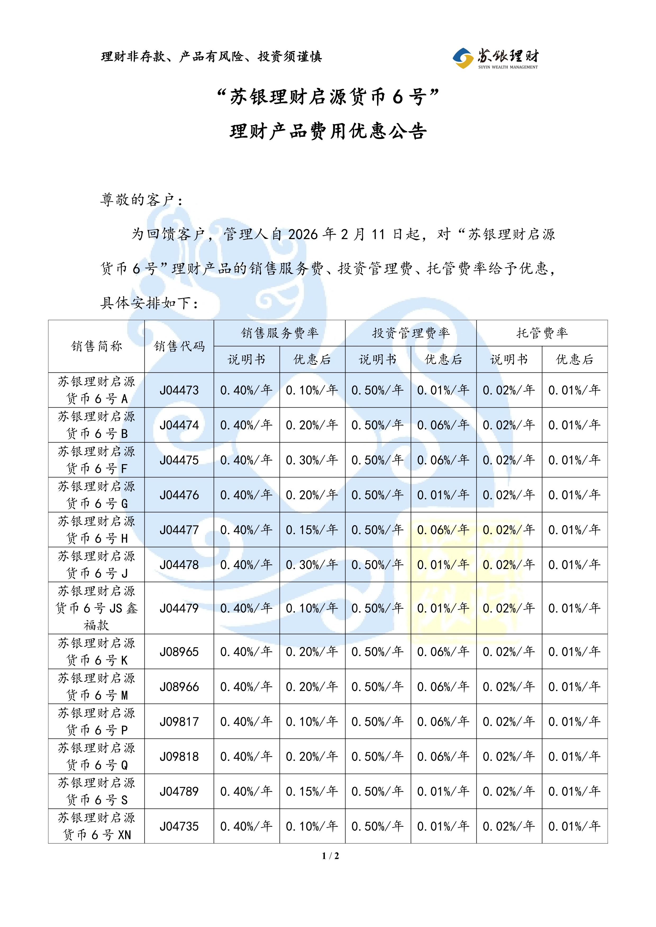 “苏银理财启源货币6号”理财产品费用优惠公告(2026年2月11日执行)