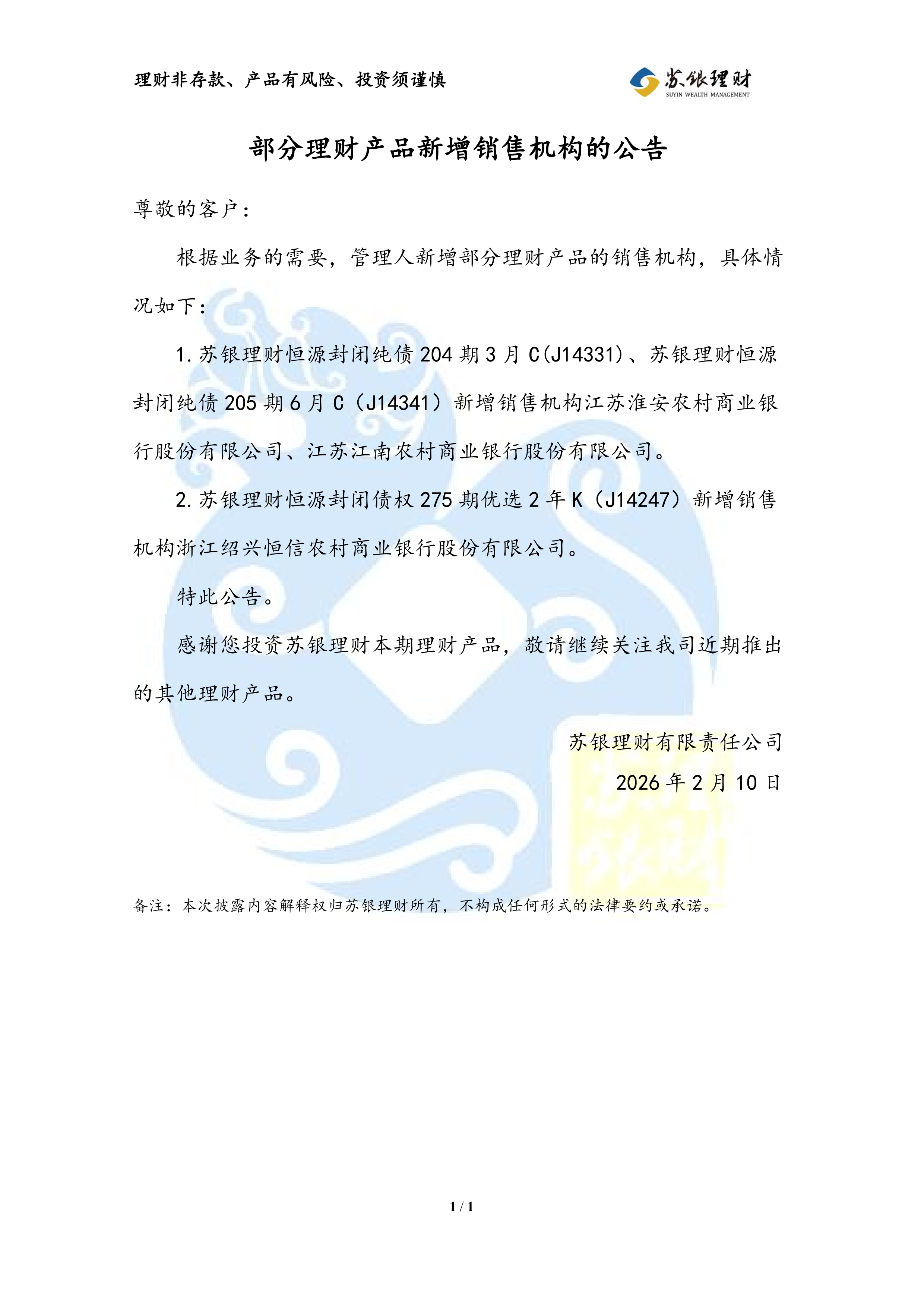 苏银理财部分理财产品新增销售机构的公告(2026年2月10日)