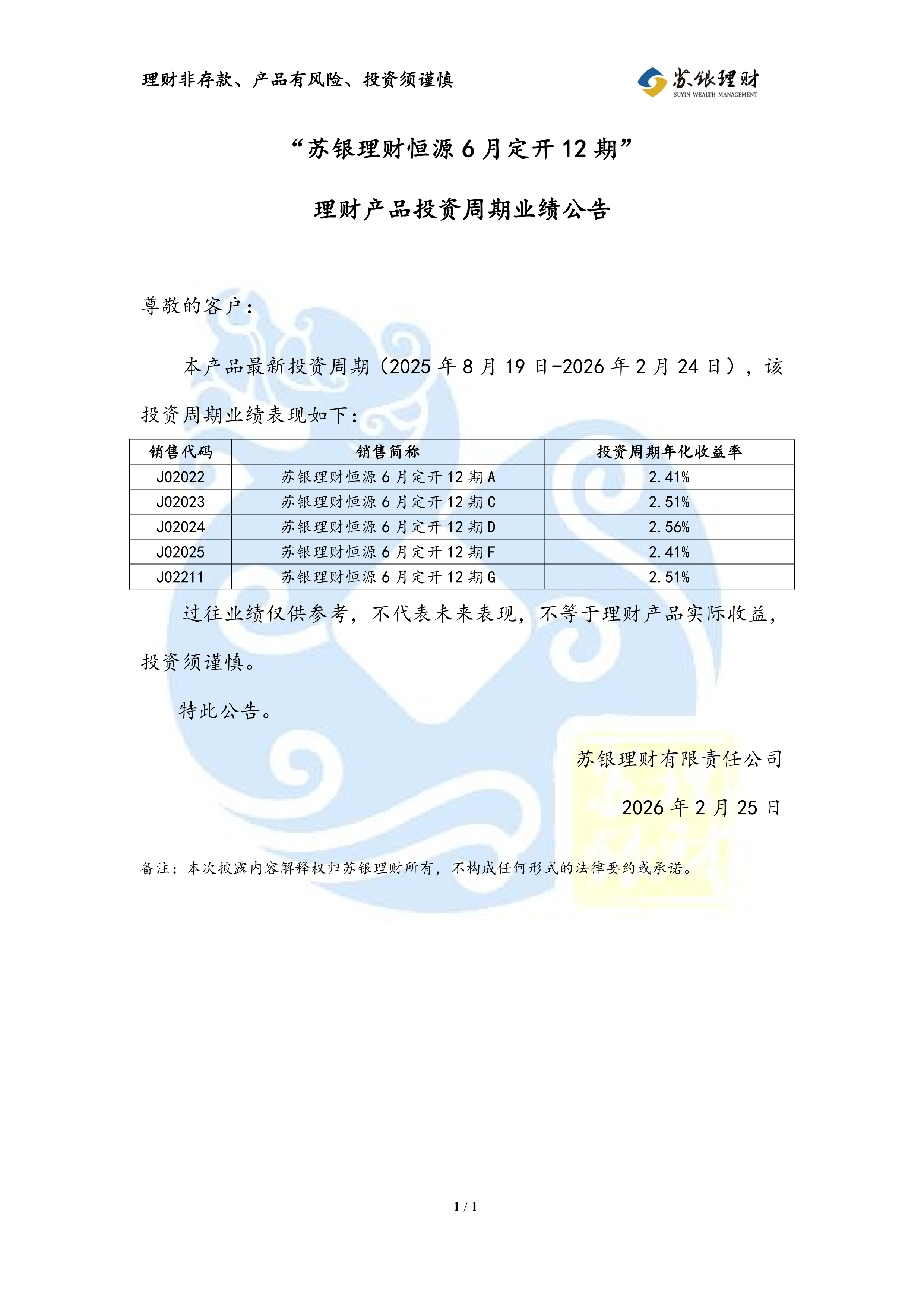 “苏银理财恒源6月定开12期”理财产品投资周期业绩公告(2026年2月25日)
