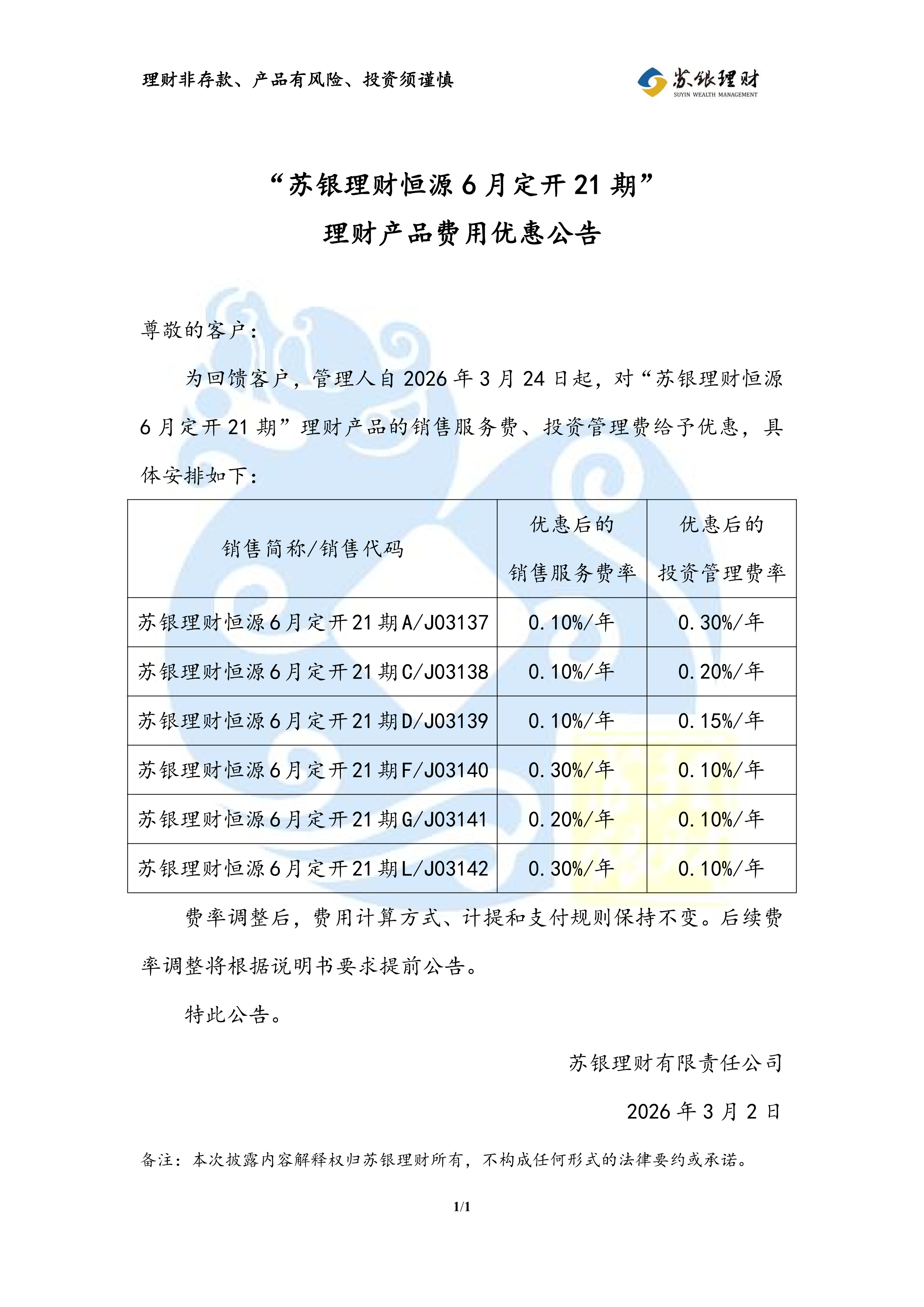 “苏银理财恒源6月定开21期”理财产品费用优惠公告(2026年3月24日执行)