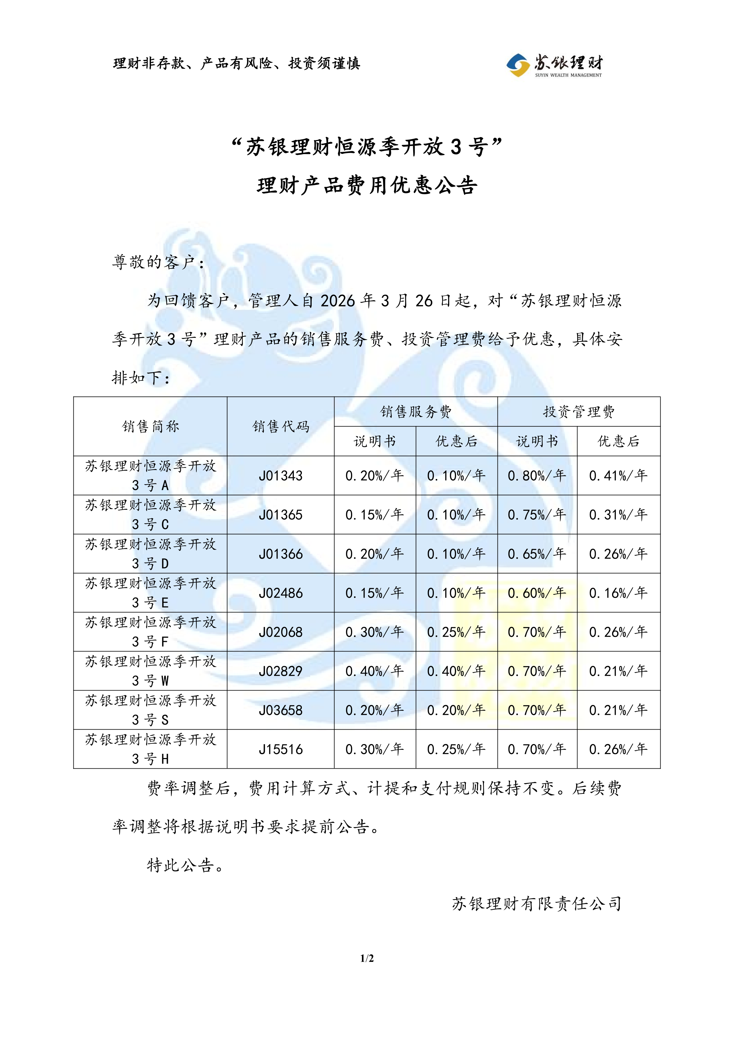 “苏银理财恒源季开放3号”理财产品费用优惠公告(2026年3月26日执行)