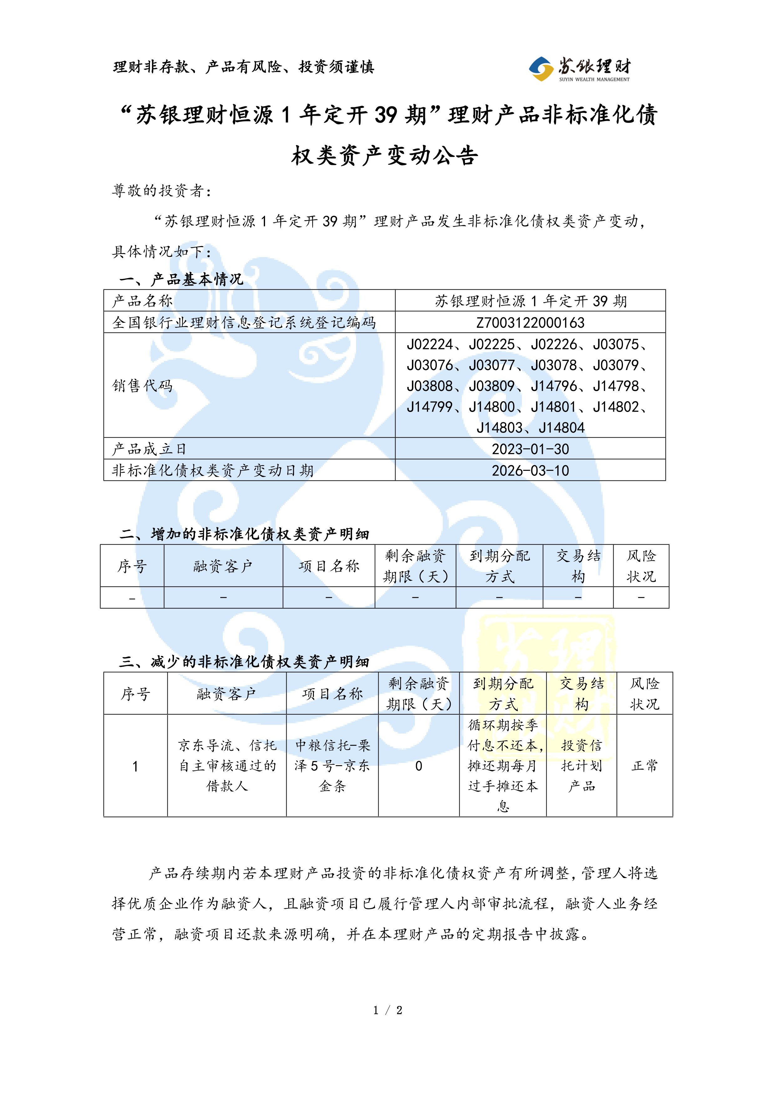“苏银理财恒源1年定开39期”理财产品非标准化债权类资产变动公告(2026年03月11日)
