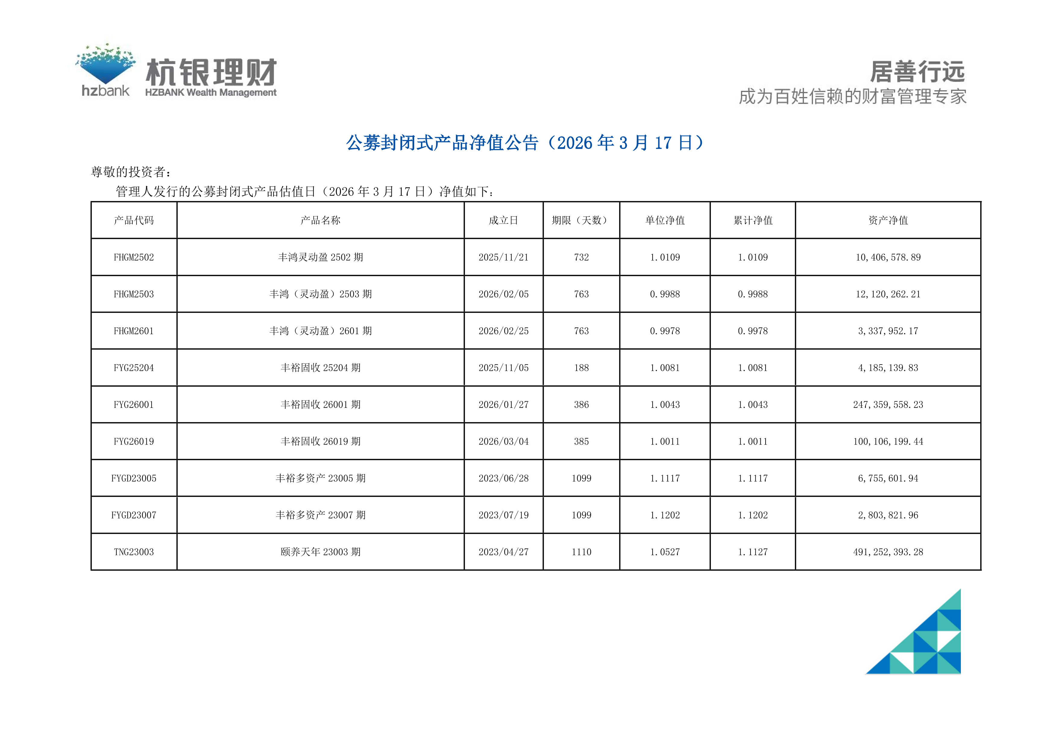 杭银理财-公募封闭式净值公告(20260317)