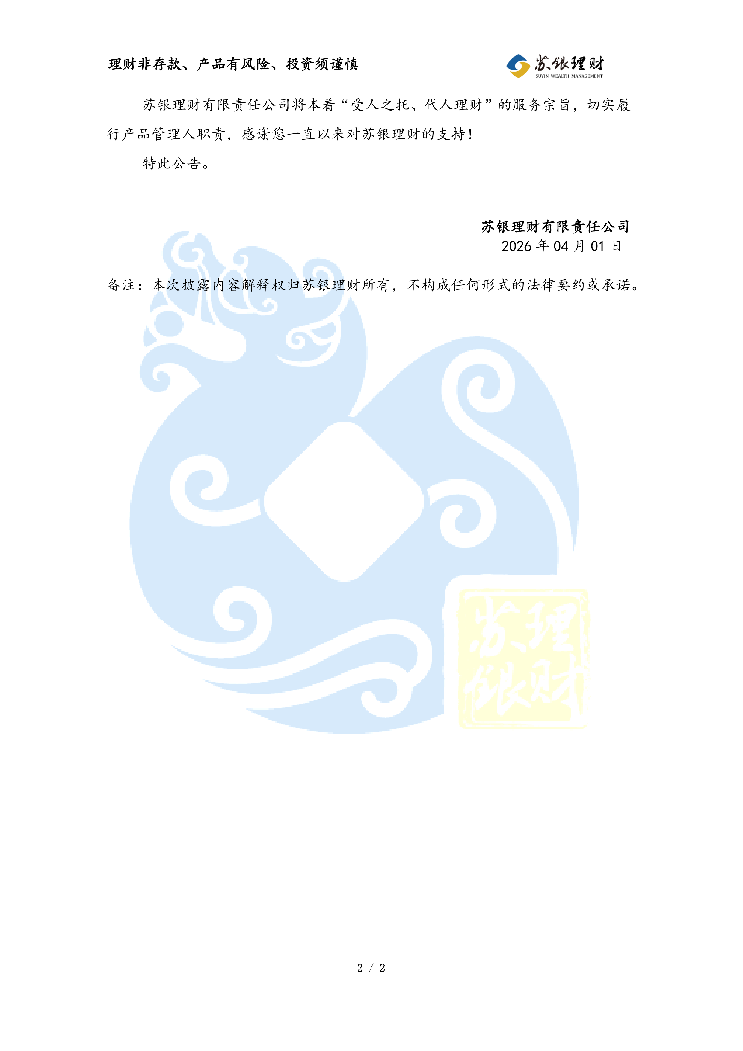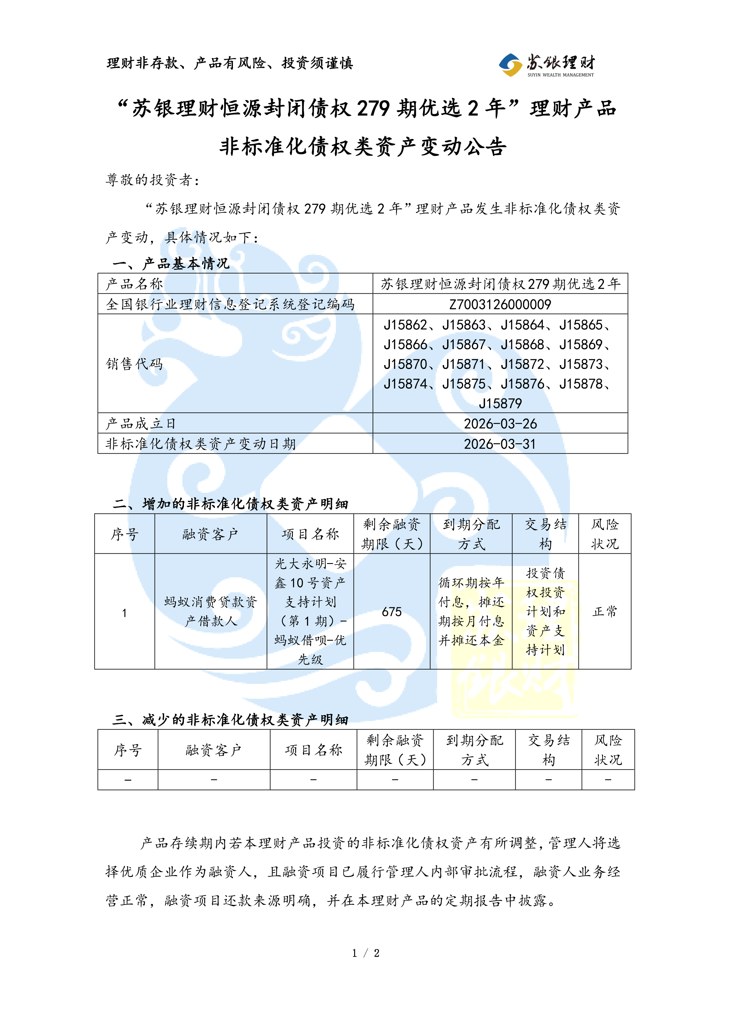 “苏银理财恒源封闭债权279期优选2年”理财产品非标准化债权类资产变动公告(2026年03月31日)