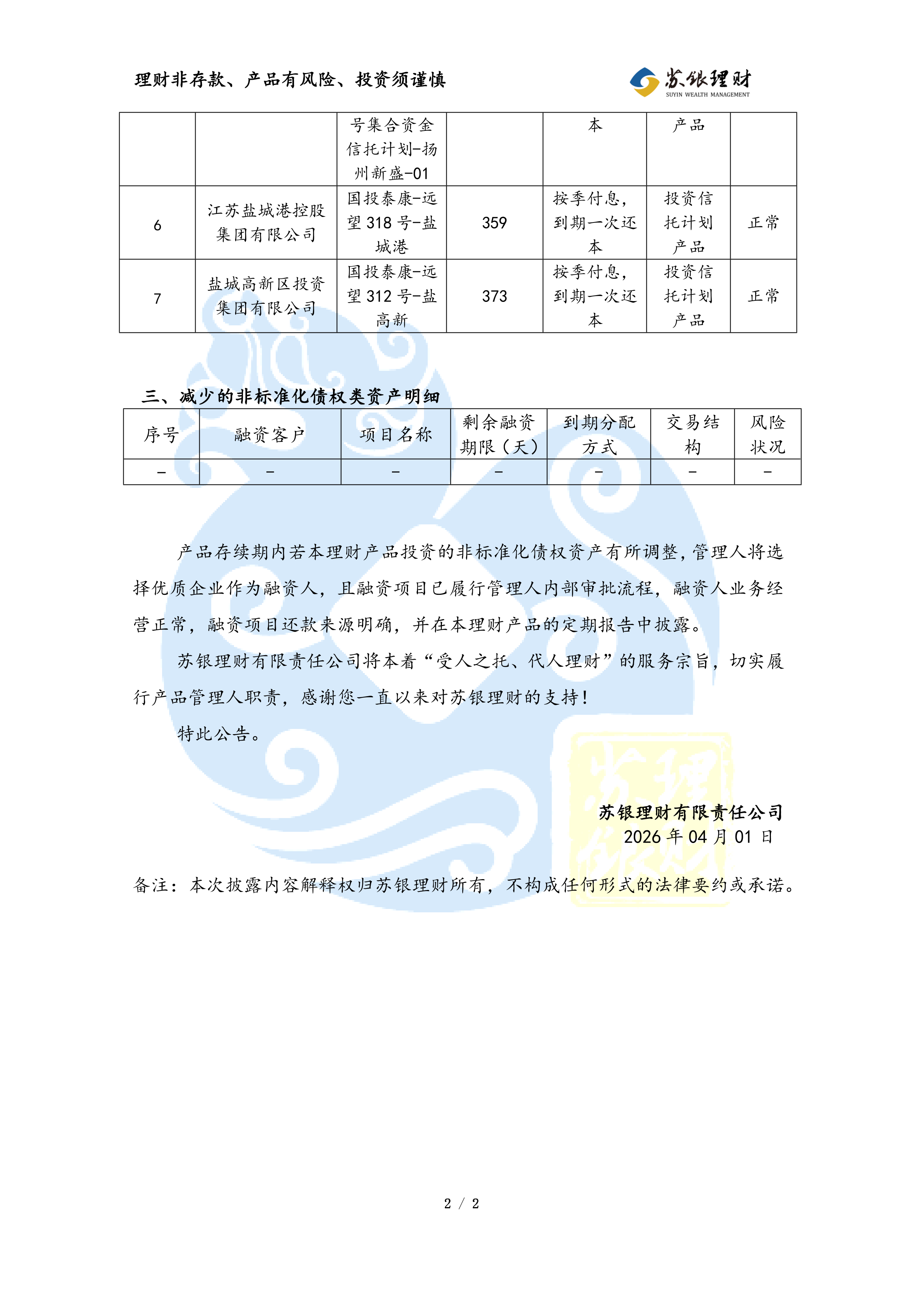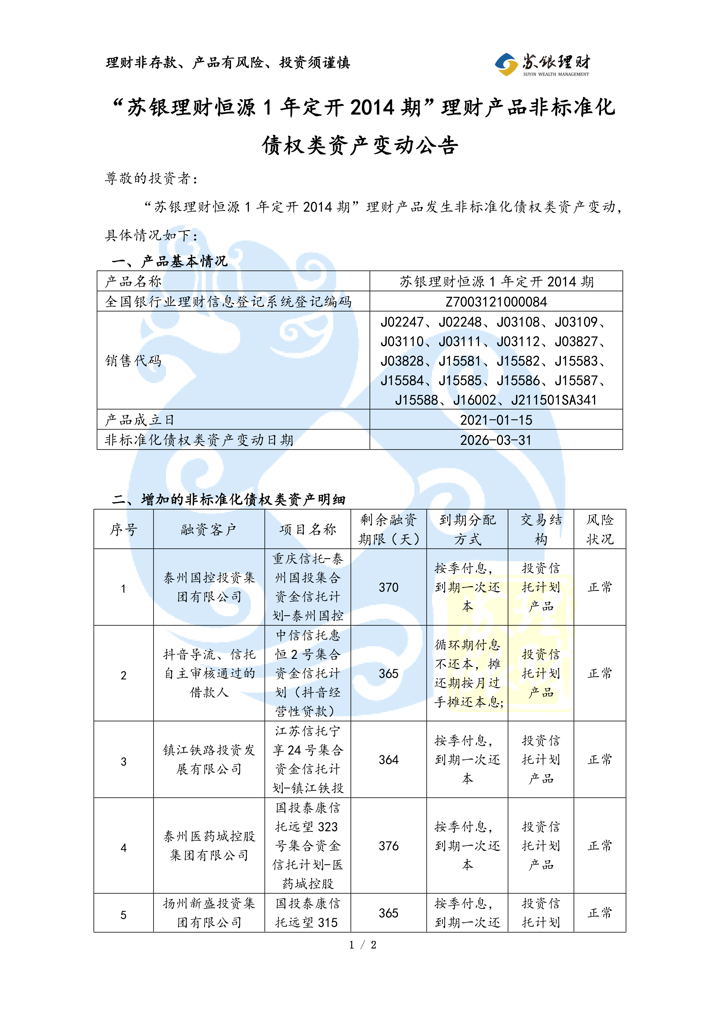 “苏银理财恒源1年定开2014期”理财产品非标准化债权类资产变动公告(2026年03月31日)