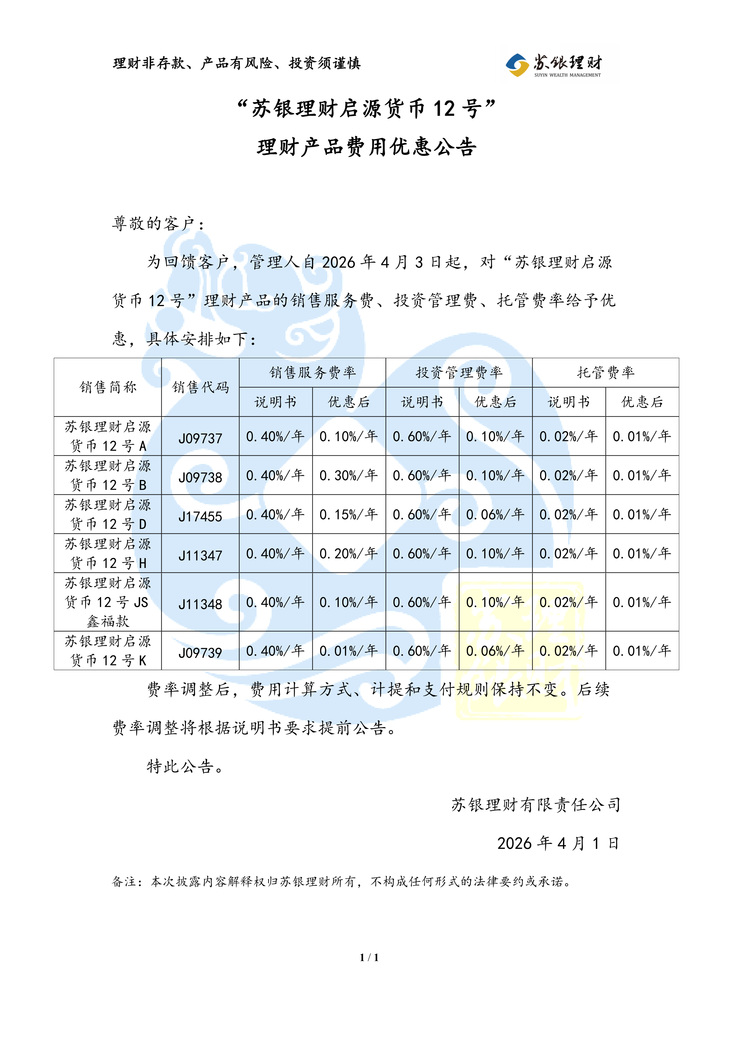 “苏银理财启源货币12号”理财产品费用优惠公告(2026年04月03日执行)