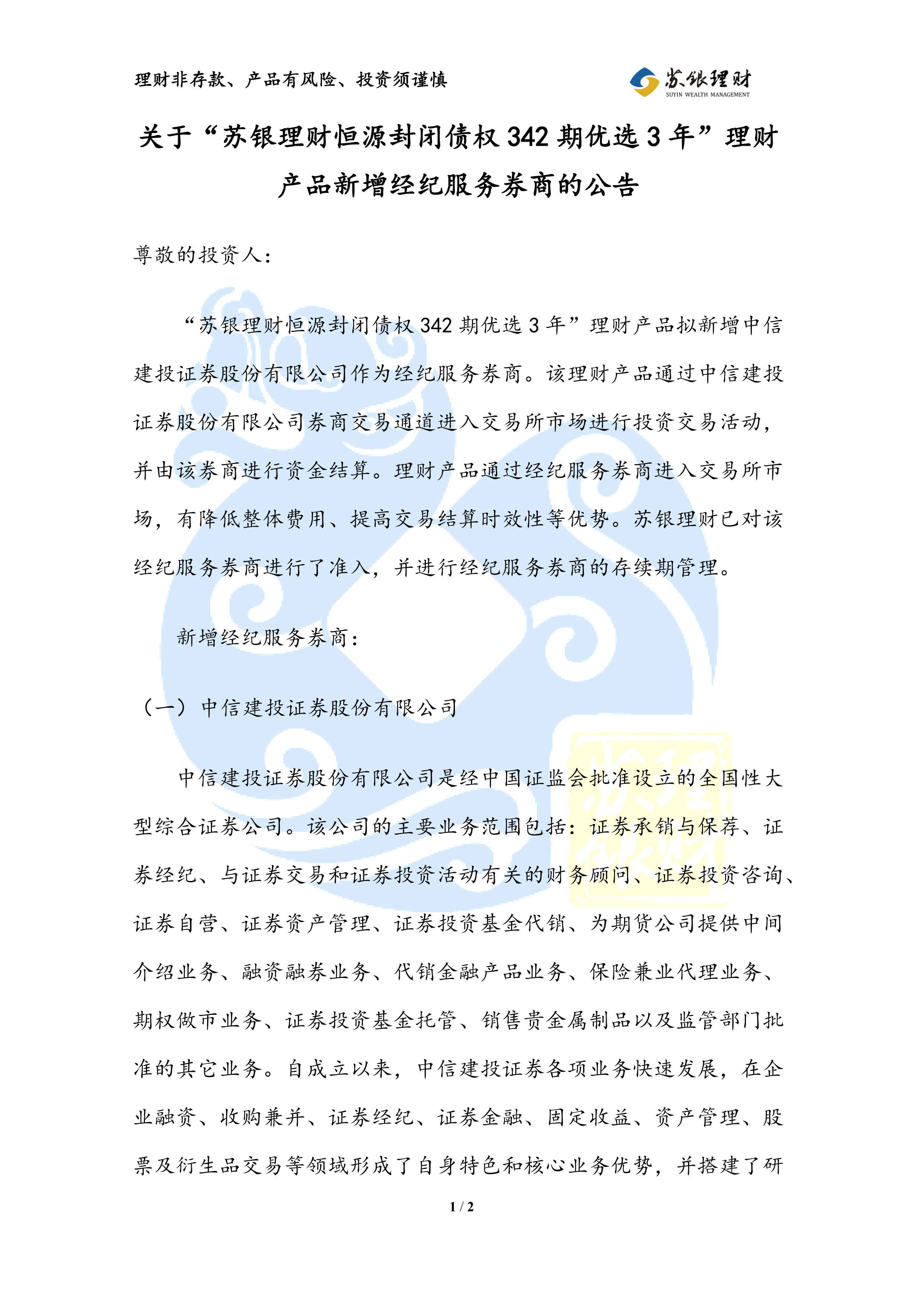 关于“苏银理财恒源封闭债权342期优选3年”理财产品新增经纪服务券商的公告(2026年03月31日)