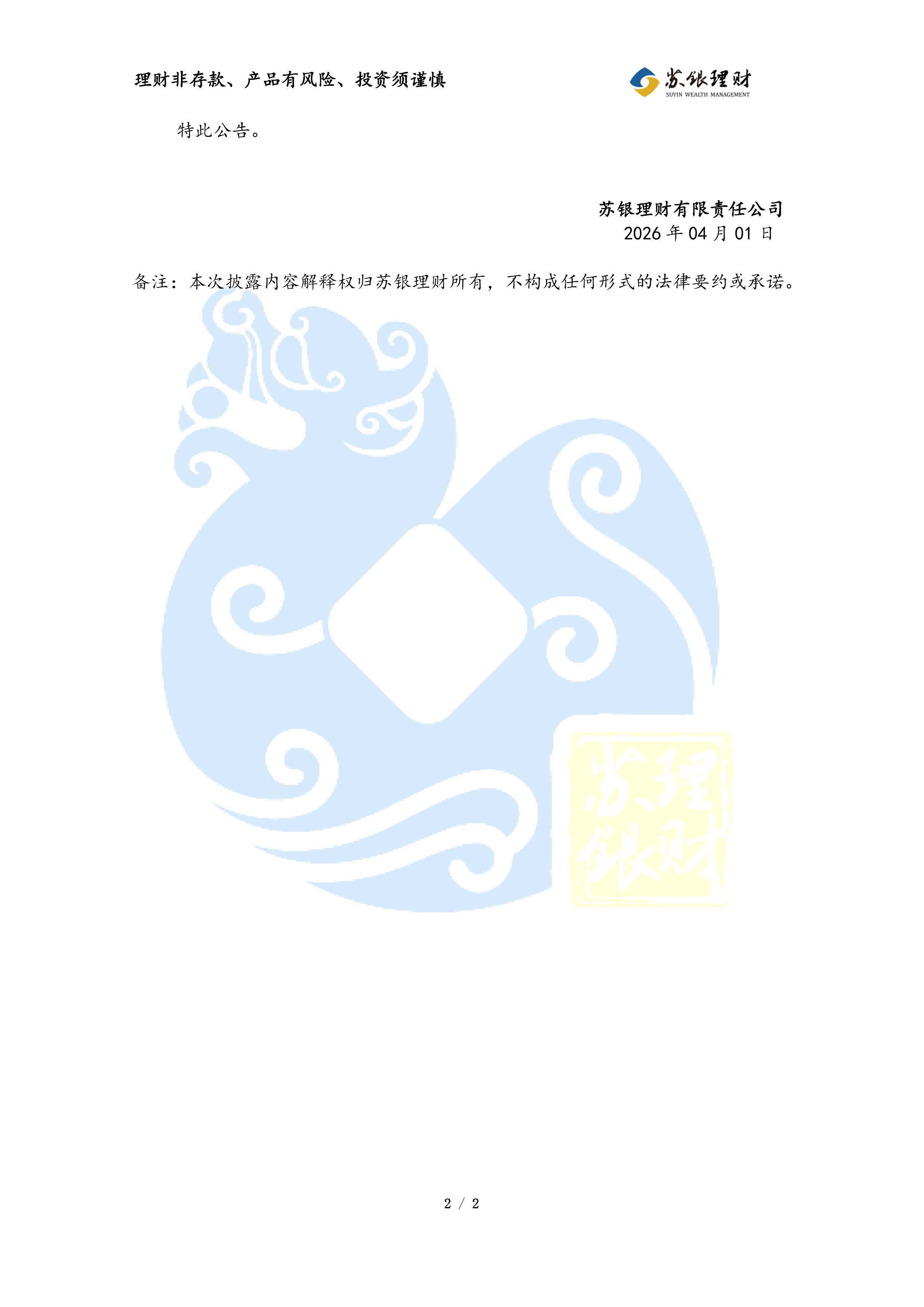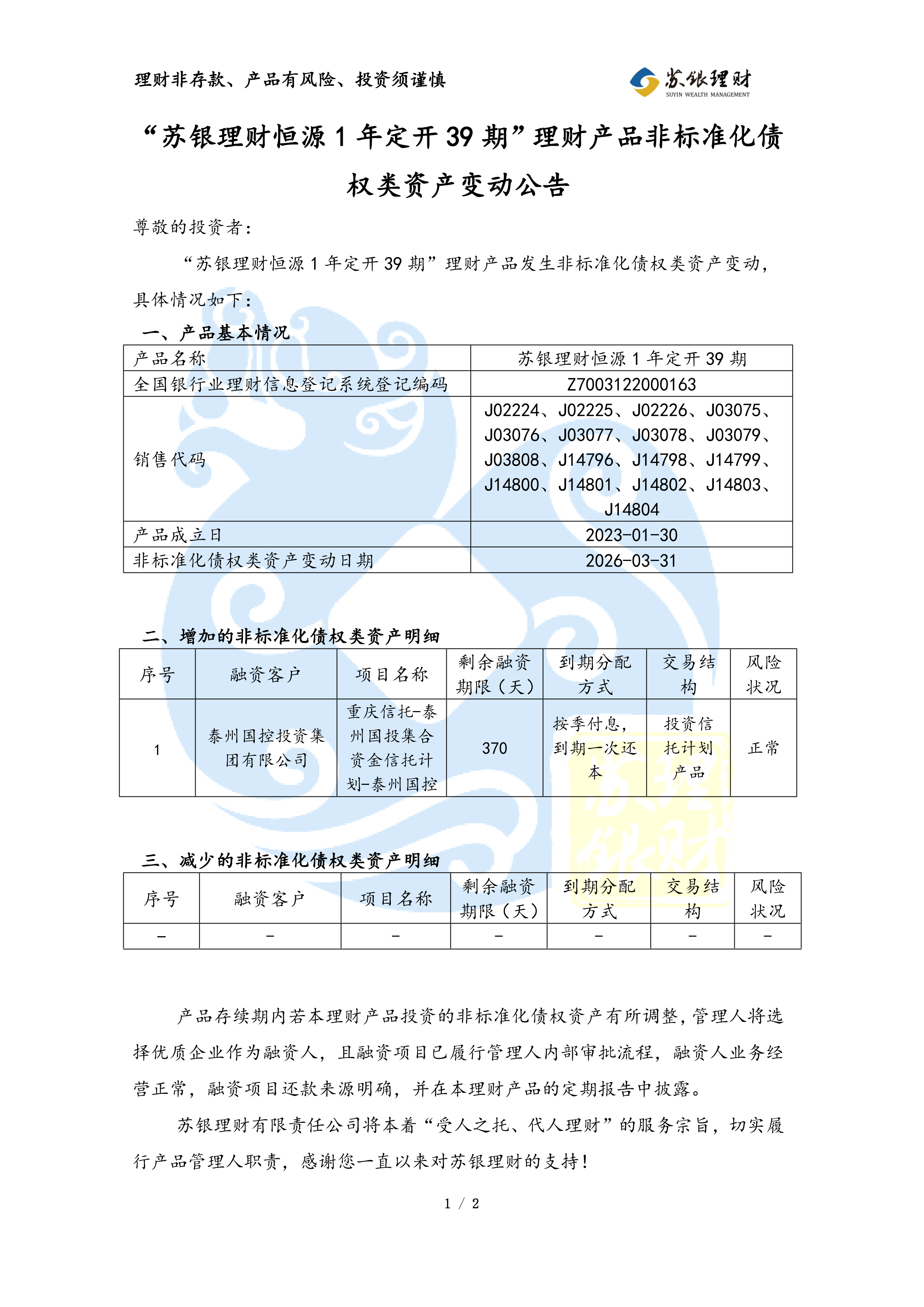 “苏银理财恒源1年定开39期”理财产品非标准化债权类资产变动公告(2026年03月31日)
