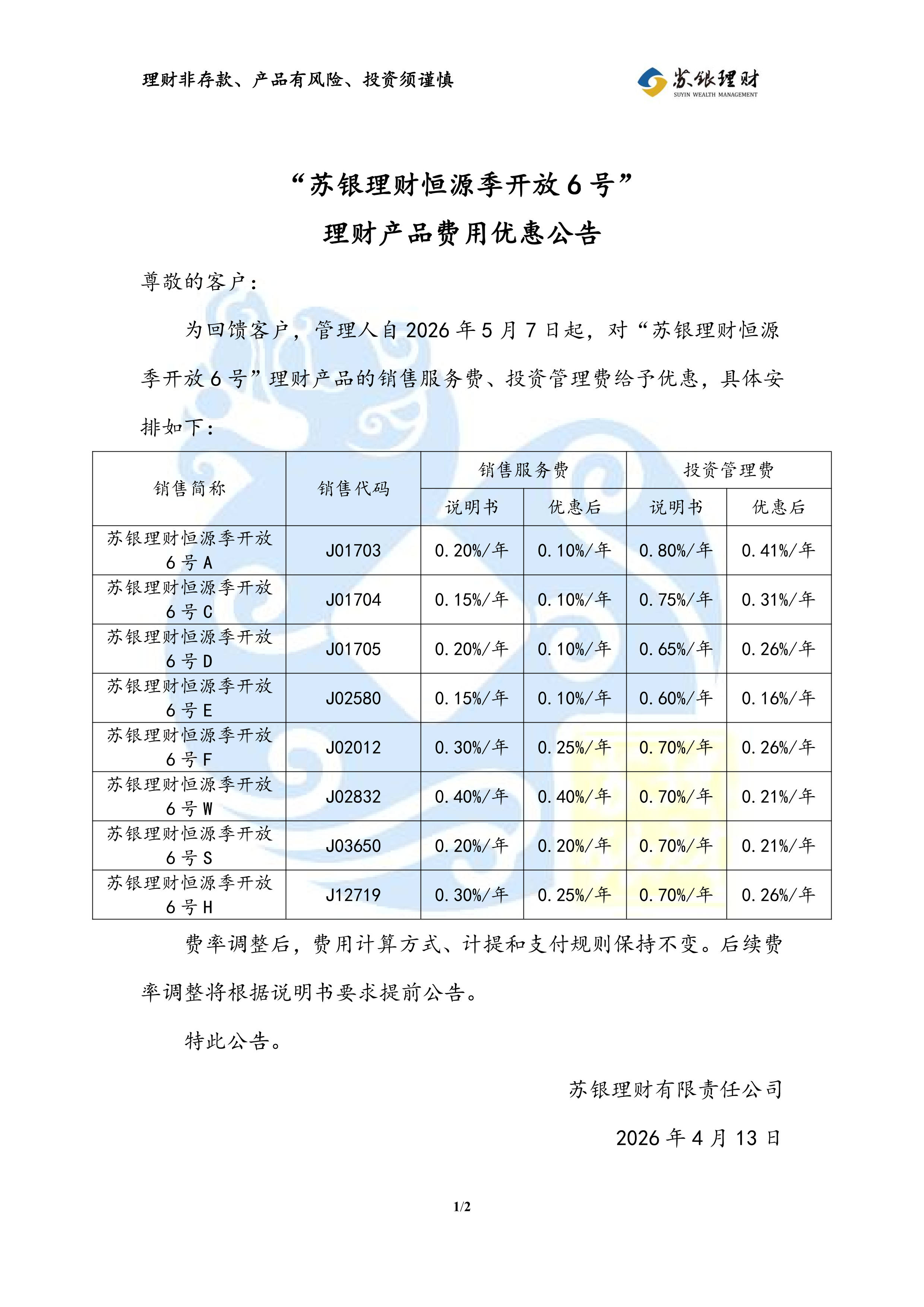 “苏银理财恒源季开放6号”理财产品费用优惠公告(2026年5月7日执行)
