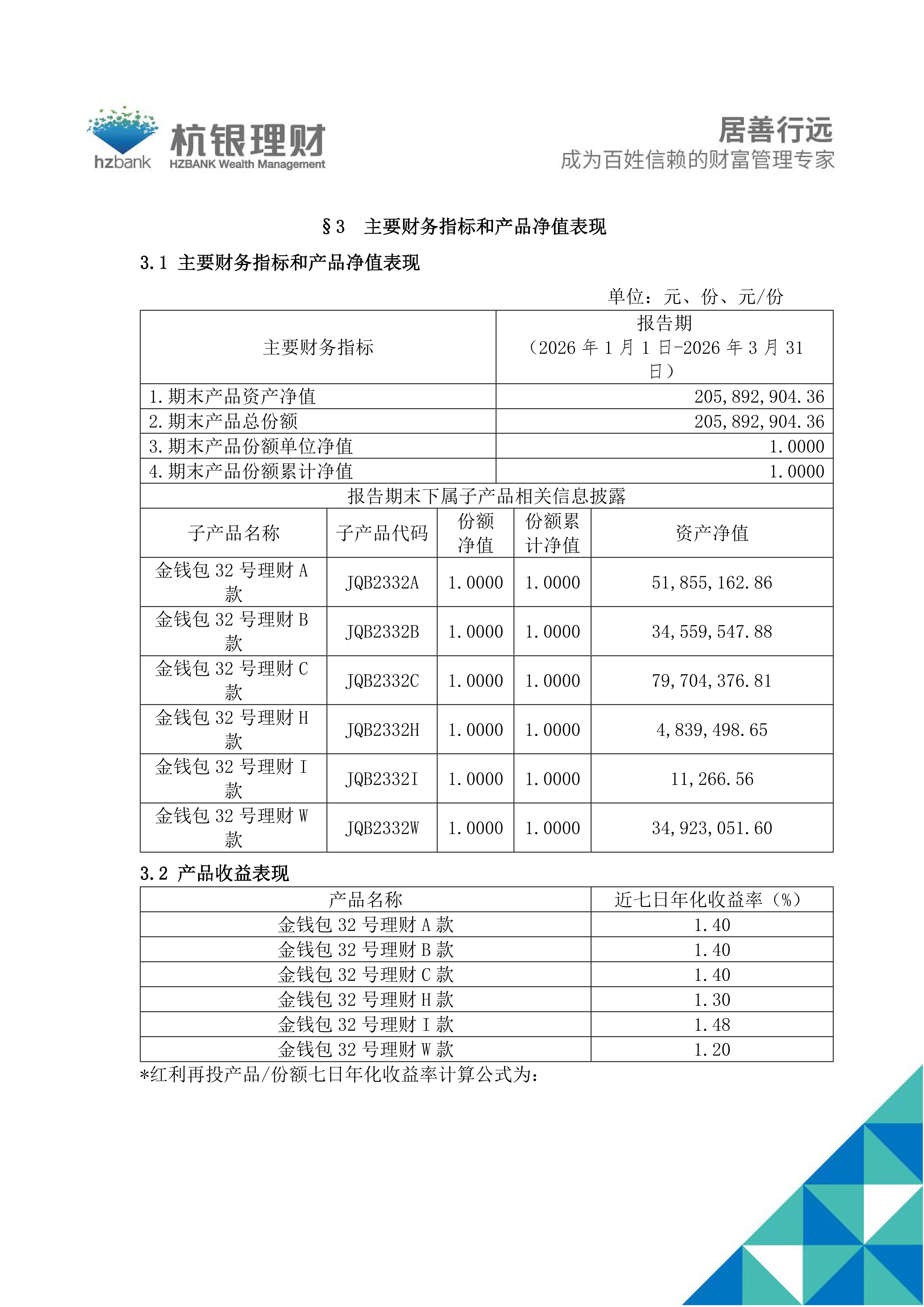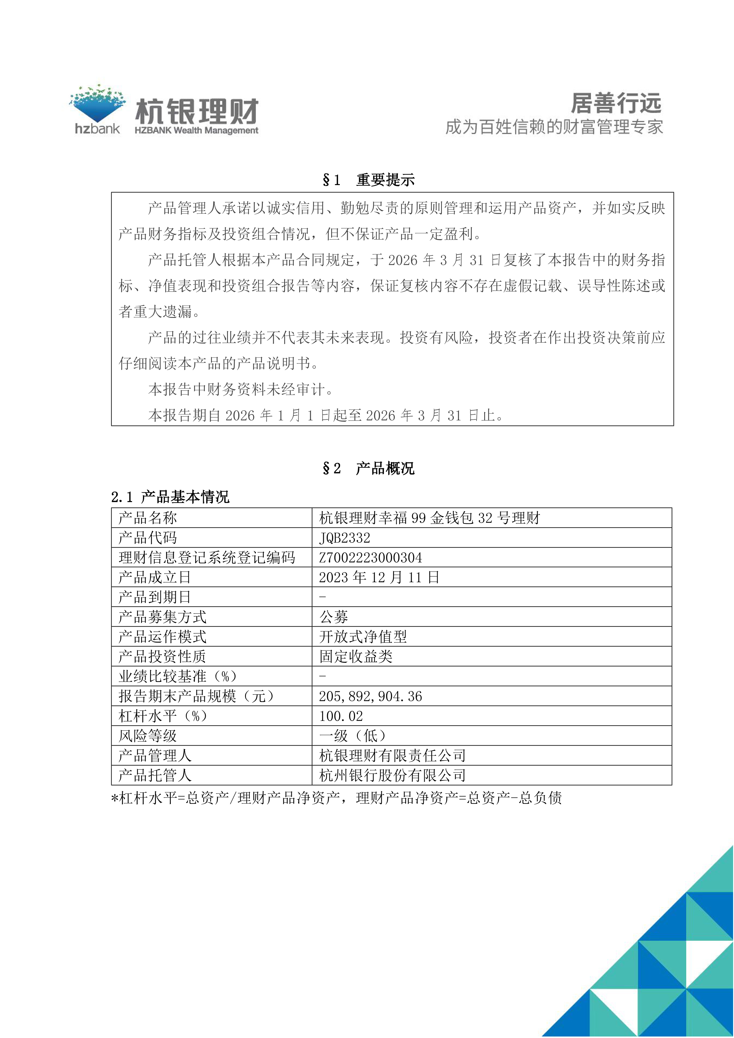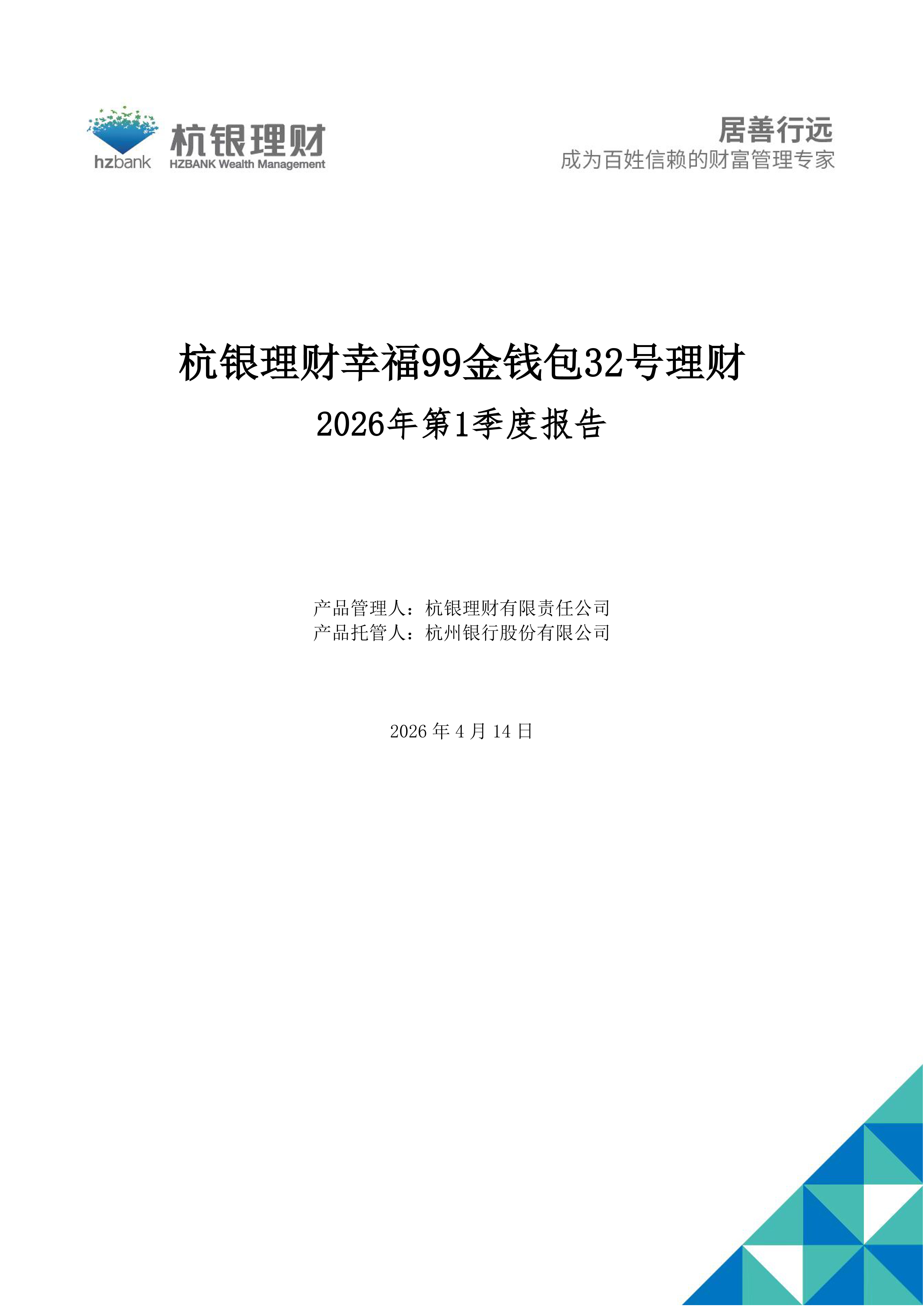 杭银理财幸福99金钱包32号理财产品2026年第1季度定期报告